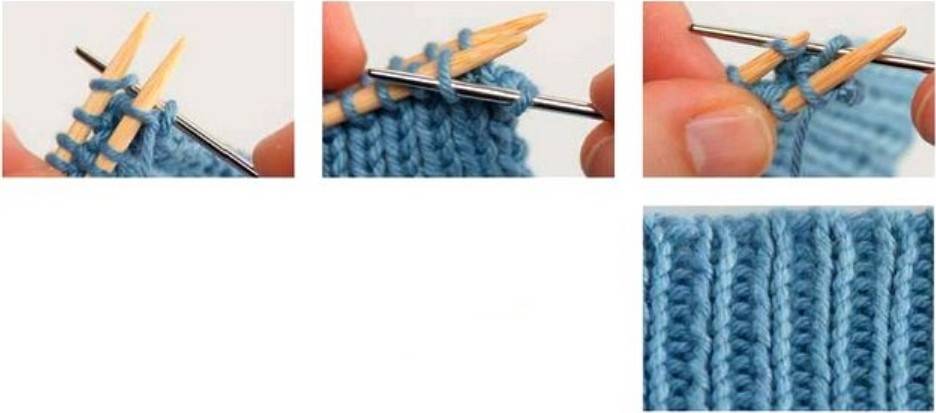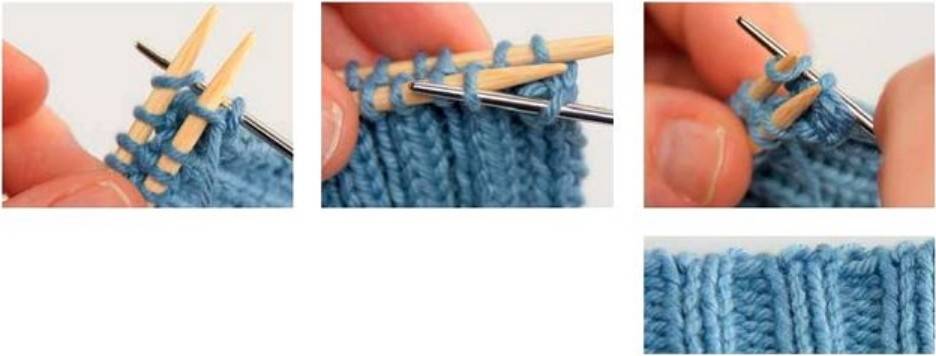 Для того, чтобы завершить петли резинки 1 х 1, выполненной спицами № 4, применяем спицы поменьше, № 2,5. Так же можно красиво закрыть петли резинки 2х2, сохраняя данный принцип действий. Над лицевой петелькой мы выполняем обратный накид, образуем лицевую, и наш накид со спицы, находящейся справа, сбрасываем.