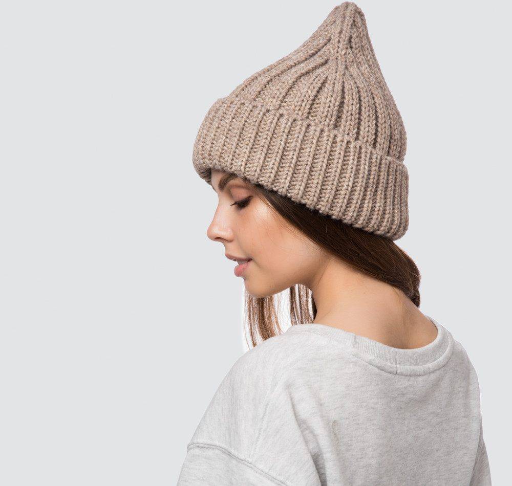 Эта вариация вязаных шапок для женщин похожа на бини, однако отличается верхушкой. Если у бини она сглаженная, плавная, то здесь остроконечная. Благодаря крупной вязке головной убор отлично сохраняет форму: острый кончик целеустремлённо направлен вверх.