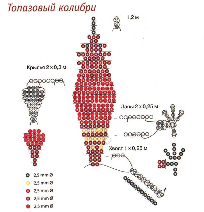 Для того, что бы сплести птичку колибри в объемном виде запаситесь проволокой 1,2 м длинной. Начинаем работу с клюва и техники плоского плетения. Продолжаем по методу объемного параллельного плетения. Лапы и крылья будут следующим этапом. Для этого протягивается проволока внутри туловища птицы из бисера из расчета две для лапок, две для крыльев. Крылья будут выполнены в технике плоского плетения, а лапки – объемного. Еще один отрезок, протянутый под последним рядом туловища, будет для хвоста. При помощи плоского плетения нанизываем бисер, а кончики скрещиваем. Начиная с пальца, который смотрит назад, нанизываем пальцы птицы из бисера. Завершаем процесс бисероплетения, протягивая проволоку вперед через весь ряд бисера. И продолжаем нанизывать бисерины для оставшихся пальцев. Скручиваем кончики и лишнее обрезаем.