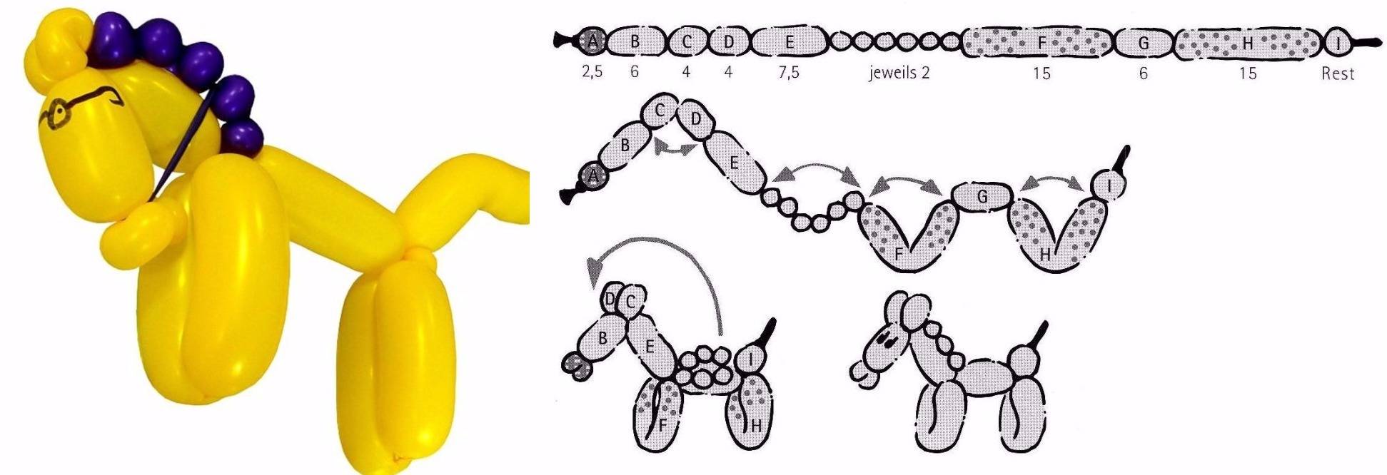Для ее изготовления выберите два шарика разных расцветок, тогда конечный результат будет смотреться эффектней. На схеме продемонстрирован вариант, как сделать лошадку из одного шарика, но ту часть, которая состоит из множества маленьких кружочков и является гривой, можно заменить шариком другого цвета. Ниже приведен пример, как это можно сделать.